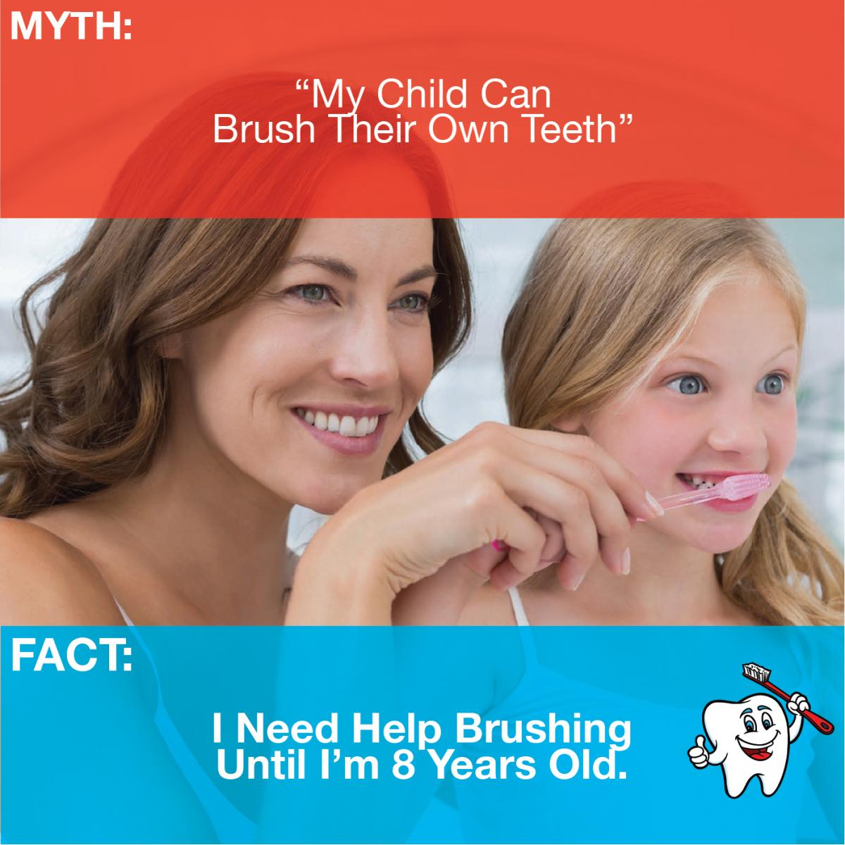 FACT:Parents and caregivers play an essential part in children’s oral health and in creating healthy lifelong habits. Young children do not have the fine motor skills to properly brush or floss their own teeth. Children need help to remove plaque and food from their teeth. An adult should help a child brush and floss until they are about 8 years old. Allow your child to brush their own teeth but then go back yourself after they are done to brush the harder to reach areas.