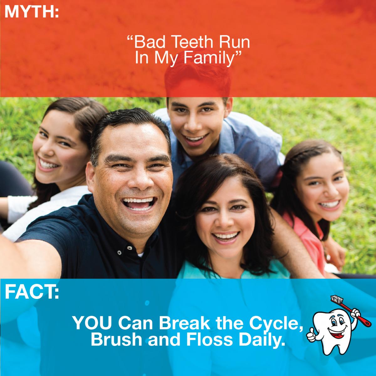 "Bad teeth don't necessarily run in the family, but bad dental habits do," says American Dental Association dentist Dr. Ana Paula Ferraz-Dougherty. Lack of regular brushing and flossing, eathing foods high in sugar and carbohydrates, and drinking sugary and acidic drinks leas to tooth decay. Many adults may have had poor oral health habits as children leading to increased dental decay as adults. YOU can break the cycle!